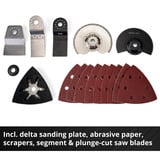 | Zubehör | vorhanden | Dreiecksschleifplatte, 9x Schleifpapier, Schaber, Tauchsägeblatt für Holz und Kunststoff (HCS), BIM Tauchsägeblatt für Metall, Segmentsägeblatt für Holz, Kunststoff und Weichmetall (HSS), Diamant-Segmentsägeblatt für Fliesenfugen | |